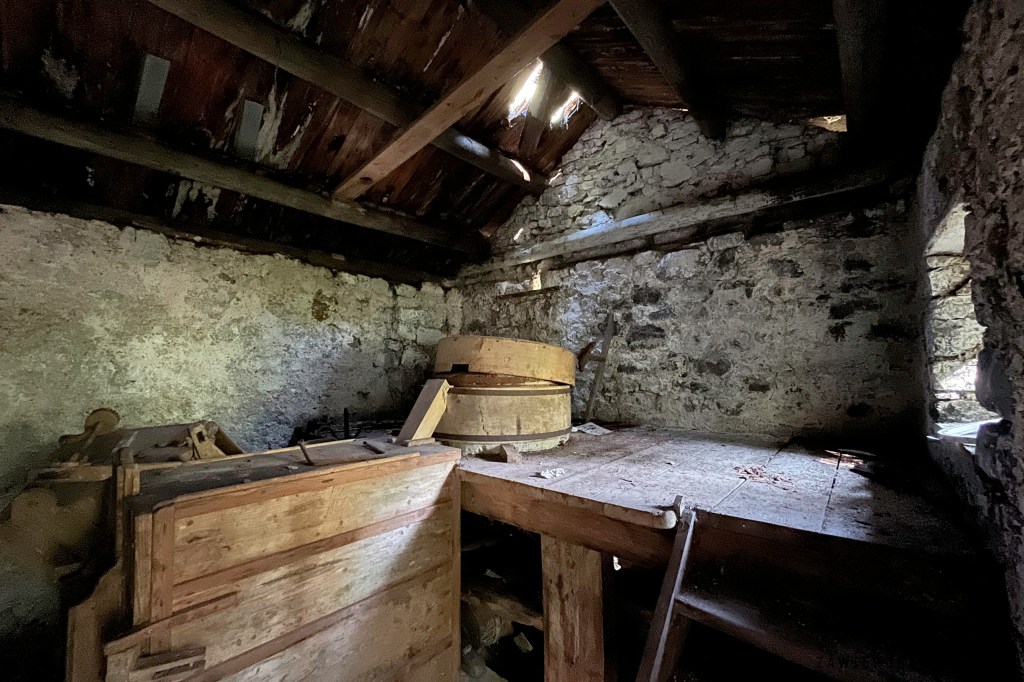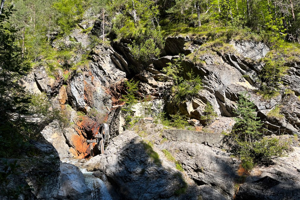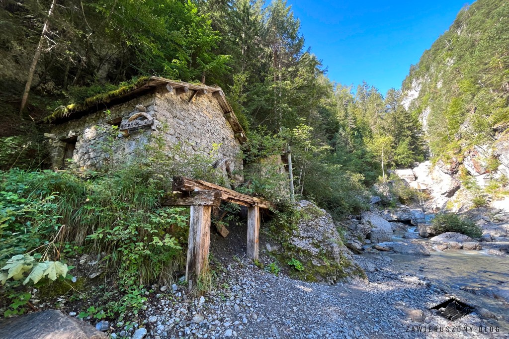 Pierwszy punkt orientacyjny tej via ferraty to stary młyn, na mapach nazwany kreatywnie Alte Mühle (niem. Stary Młyn). Przed rozpoczęciem wspinaczki zaglądamy do środka. Widać tam jeszcze jakieś elementy machinerii, ale poza tym panuje ostry bałagan. Tak, wiem, czepiam się – przecież to stary młyn a nie galeria sztuki. Na zewnątrz budynku widać jeszcze kawał koła młyńskiego. Podobno cały budynek zachował się tu w pierwotnym stanie, bez żadnych modyfikacji[3]. Cóż, jestem w stanie uwierzyć, że nikt tu nie robił remontów przez ostatnich kilkaset lat.