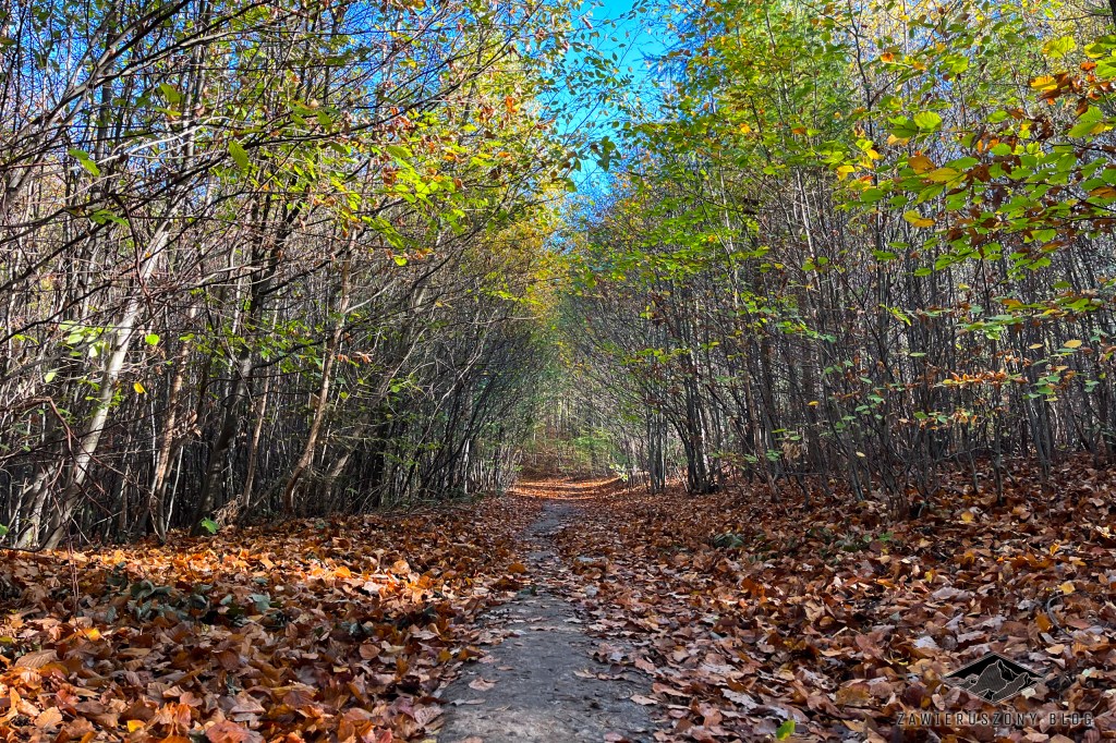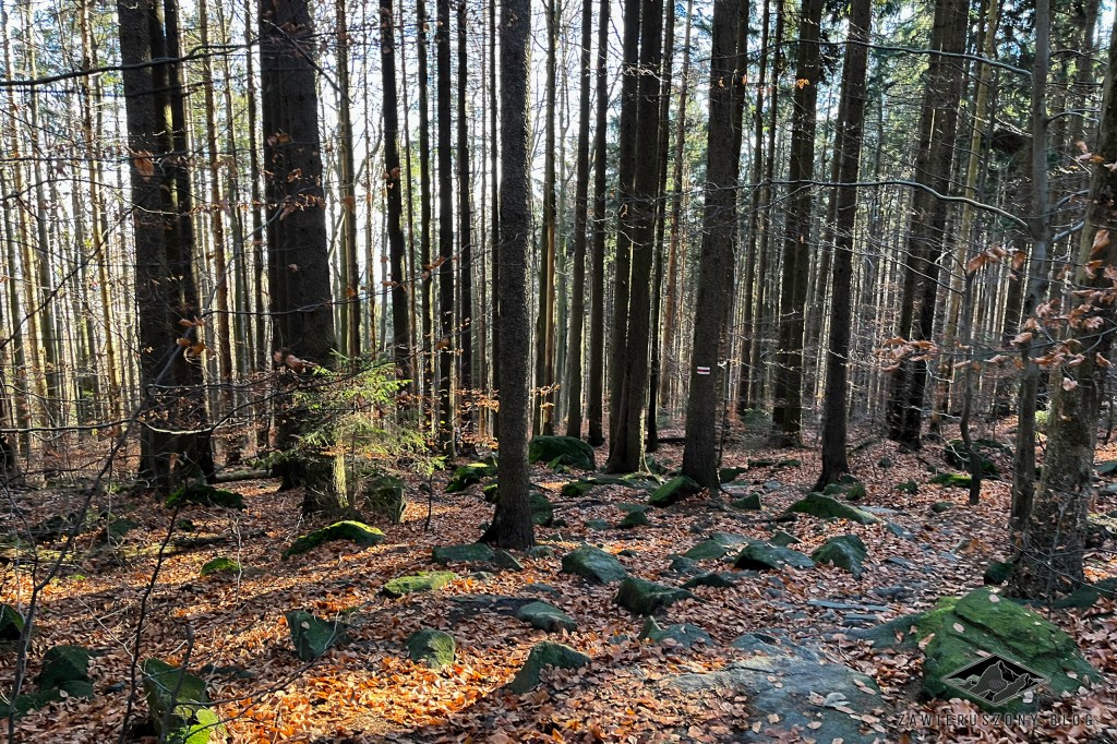 Na czerwonym szlaku szybko gubimy wysokość. Trasa jest pokryta liśćmi i nie widać wszystkich kamieni i dziur pod nimi, ale i tak udaje się schodzić całkiem sprawnie. Mimo tego udaje mi się poprzyglądać tutejszym leśnym widokówkom. Przypominające mogiły fragmenty skał robią niesamowite wrażenie.
