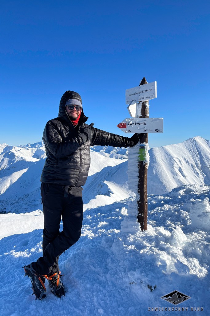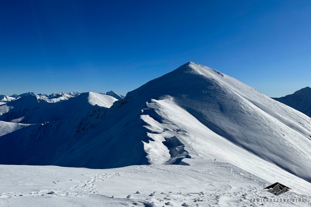 Kończysty Wierch zdobywamy o godzinie 11. Tam robimy krótką przerwę przed najważniejszym podejściem tego dnia, czyli przed podejściem na sam Starorobociański Wierch. Po przekąsce ruszamy dalej. Przełęcz łącząca dwa szczyty jest mocno zasypana śniegiem i miejscami trudno powiedzieć, gdzie kończą się skały, a zaczyna masyw lodu. Dlatego idziemy w pewnym oddaleniu od krawędzi zbocza.