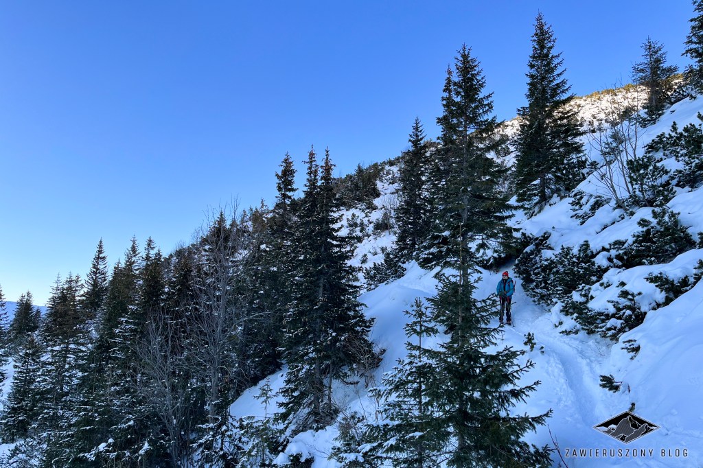 Trasę zaczynamy od zejścia zielonym szlakiem w kierunku rozwidlenia pod Wielkim Kopieńcem (1257 m n.p.m.) (ciekawostka: jest on niższy od Małego Kopieńca – 1329 m n.p.m.). Tam skręcamy na szlak czerwony. Ten zaczyna ostro przecinać poziomice w drodze pod górę, biegnąc zboczem obok Kopieńców. Ścieżka jest już udeptana, ale i tak niewiele czasu upływa do chwili, w której zakładamy raki. Bez nich podejście byłoby udręką. A może i zagrożeniem.