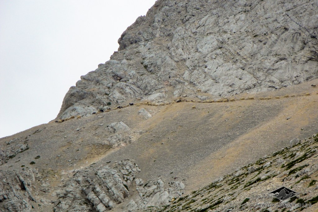 W końcu pokonujemy najgorszy fragment i przez chwilę możemy odetchnąć na długim trawersie. Po pokonaniu go, wychodzimy w pobliże leju krasowego Snezna konta. Z miejsca rzucają się nam w oczy dość duże pokłady śniegu oraz stado owiec, które trawersuje Triglavski Vogel. Oczywiście – jak przystało na alpejskie standardy – owce ewidentnie spacerują samopas.
