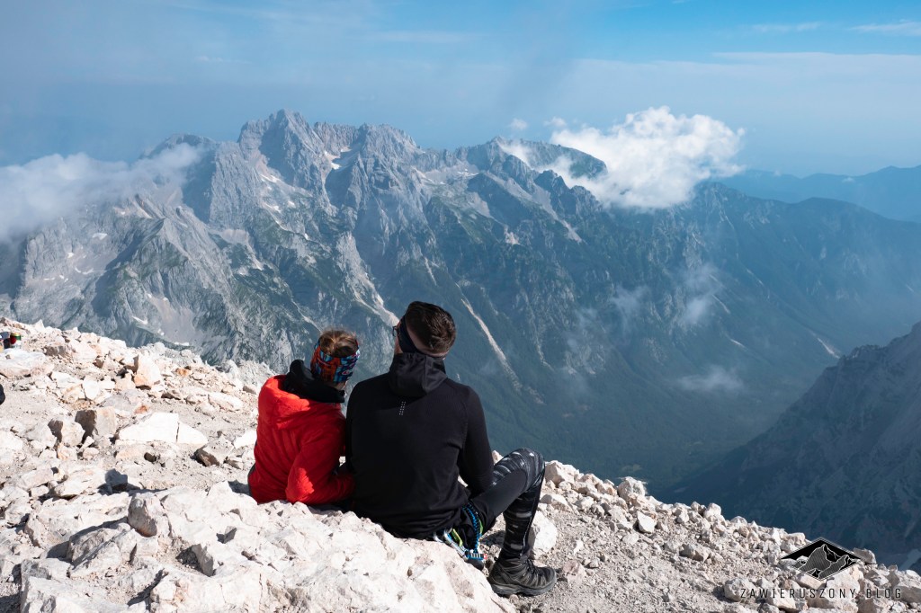 Triglav zdobywamy około godziny 8:40. Czyli trasa od schroniska, umiarkowanym tempem, zajęła nam niecałe dwie godziny. Na szczycie przerwa – pora coś zjeść i zrobić pamiątkowe zdjęcia. Podobno można tu też spotkać pana handlującego piwem, ale akurat nam się to nie zdarza. Może w poniedziałkowe poranki bywa tu mniejszy ruch i sprzedaż jest nieopłacalna, a może po prostu pan już wyprzedał swoje zapasy przez weekend. Spotykamy natomiast Polaków, którym Artur robi kilka zdjęć. Nie wiemy, że akurat ci rodacy jeszcze nam o sobie przypomną.