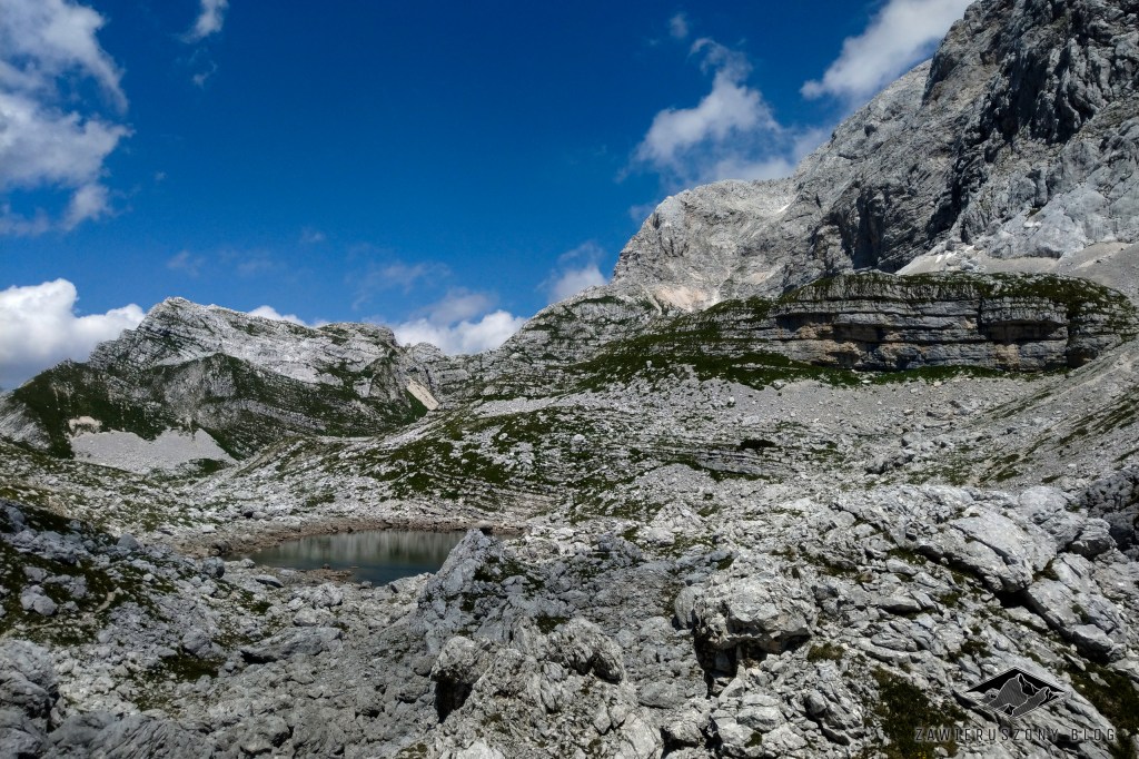 Wśród wspomnianego buszu, wita nas swoim lekko lazurowym kolorem Dvojno Jezero. Może nawet dwa Dvojne Jezera – bo czasem, w suchszym okresie, jezioro to dzieli się na dwie części. Sam już nie jestem pewien czy tamtego dnia tafle były dwie, czy może tylko jedna. Pamięć zawodzi, a fotografie nie pomagają sobie przypomnieć. Tak czy inaczej, tuż za drugą częścią jeziora z lasu wyłania się wspomniane schronisko przy Jeziorach Triglavskich.
