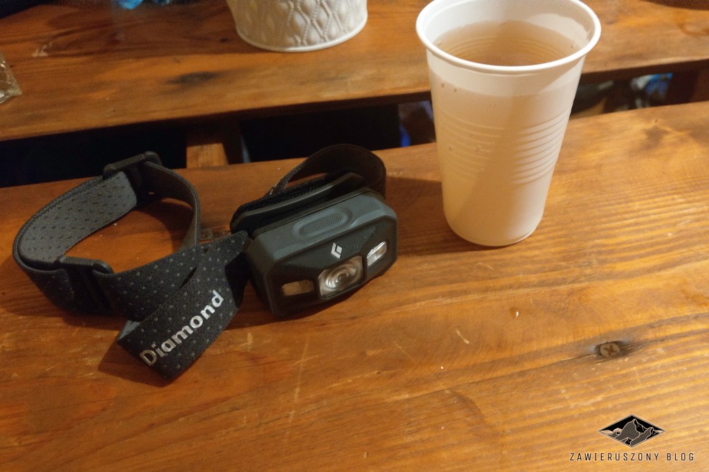 Zegarek, smartfon, czołówka. Wodoodporne, oczywiście. Czołówka o jasności 300 lumenów zdecydowanie wystarczyła, nie musiałem jej ustawiać na pełną moc. Nawet po ustawieniu na 1/3 jasności nie było widać mojej twarzy na selfie.