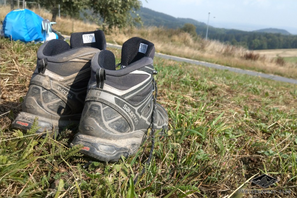 Wodoodporne buty. Salomon, z outletu. Pierwszy raz założyłem je właśnie na to przejście. Na początku pasowały idealnie, ale gdybym miał kupować nowe w tym tygodniu, pewnie wybrałbym o rozmiar większe – stopy mi trochę przez ten weekend urosły. W każdym razie, Goretex się sprawdził i woda mogła dostać się do nich co najwyżej od góry. Myślałem też o wzięciu butów do biegania, ale te nie sprawdziłyby się ze względu na warunki pogodowe. Dobre trekkingi to podstawa.