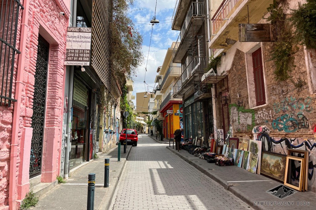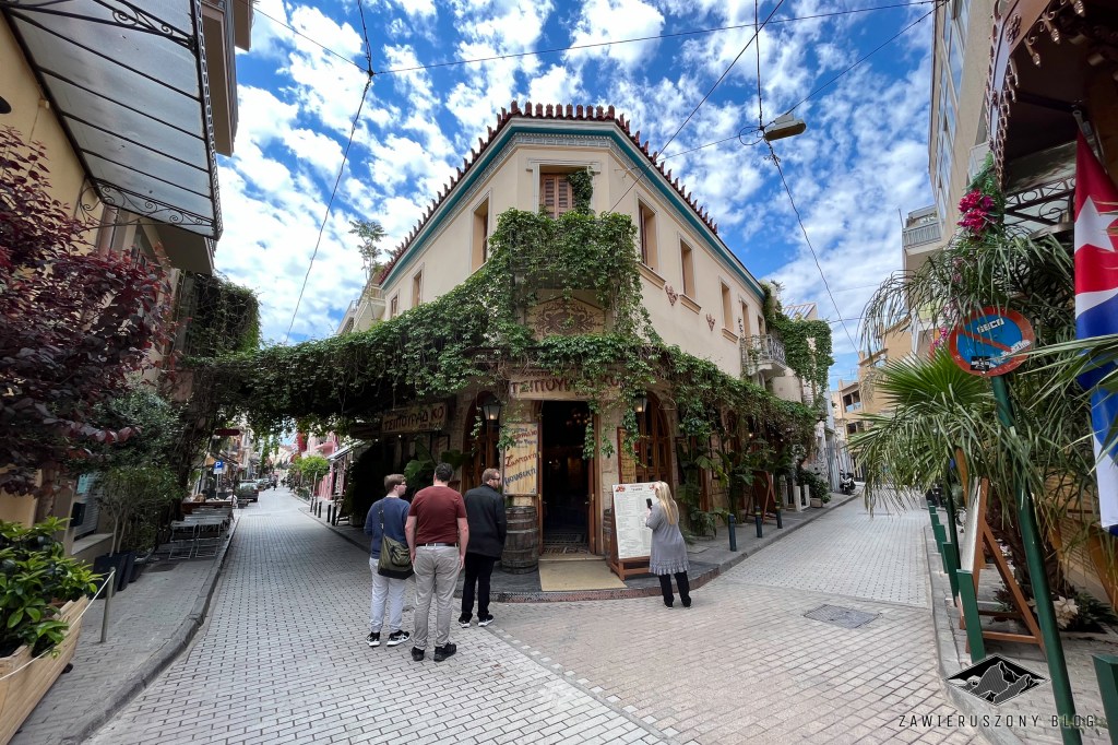 Chwilę później zagłębiamy się w kolorowe uliczki dzielnicy Psirri. Miejscami w oczy rzucają się niesamowite murale, których podobno jest więcej tuż za jakimkolwiek rogiem. Wzrok przyciągają kolorowe budynki z odważnym wystrojem. Restauracyjki i lokale to mieszanina stylów: od tradycyjnych greckich knajp z historią sięgającą ponad stu lat, poprzez kiczowate bary rodem z Disneylandu, aż zaniedbane zaułki i zwykłe lokale usługowe.