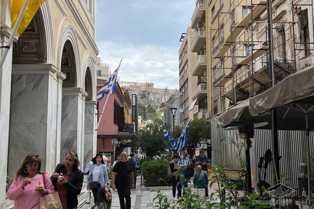 Z muzeum wychodzimy zmęczeni i ruszamy ponownie w kierunku centrum. Po drodze zwracamy uwagę na budynki Politechniki Ateńskiej, a potem jeszcze Uniwersytetu Narodowego, osadzone gdzieś między dawnymi zabytkami a współczesnym budownictwem. Przez plac Klafthmonos odbijamy w kierunku placu Monastiraki i zahaczamy po drodze o coś do jedzenia.