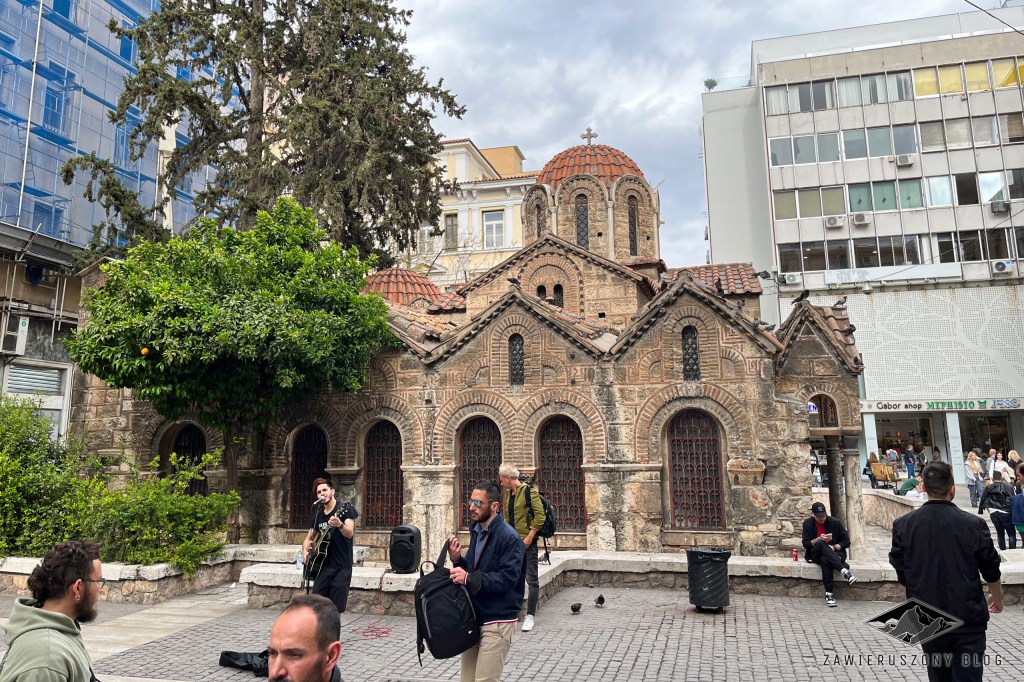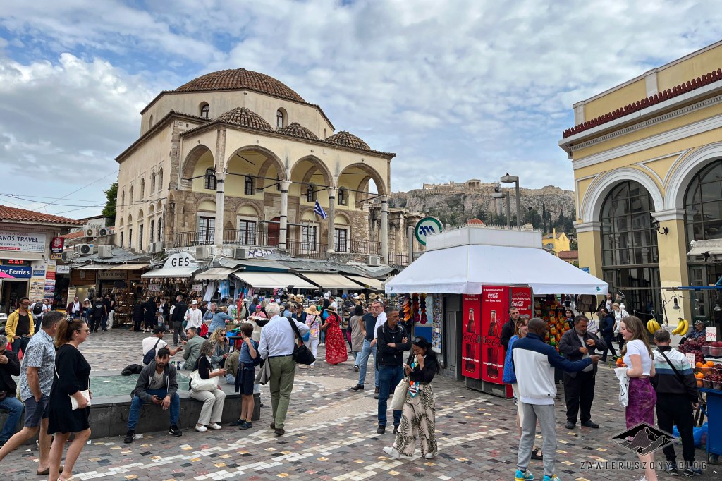 Po chwilowym odpoczynku od miejskiego gwaru, wynurzamy się z oazy Ogrodu Narodowego i kolejny raz na tym wyjeździe przecinamy plac Monastiraki. Plac tętni życiem, które mimo wszystko opiera się skwarowi. Płynąca tędy dawniej rzeka wolała schować się pod mozaiką kafli ułożonych na powierzchni tego miejsca, ale ludziom upał jakby nie przeszkadza. Ale to chyba nic dziwnego, bo niemal na każdym kroku można tu kupić kawę lub owoce, zobaczyć jakiś zabytek – np. meczet Tzistarakis – lub po prostu wejść w gąszcz uliczek wypełnionych sklepikami i kupić jakąś pamiątkę, w postaci magnesu na lodówkę czy tutejszej odmiany gry w młynek.