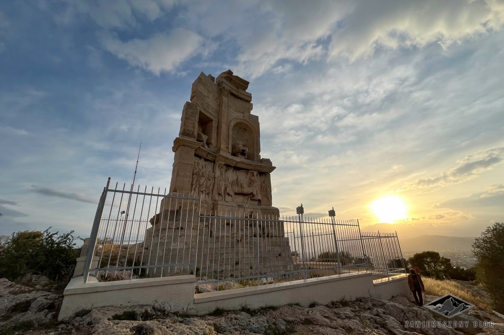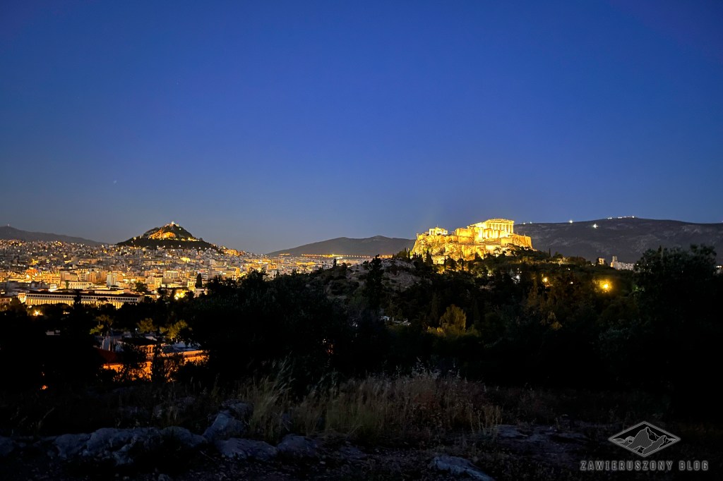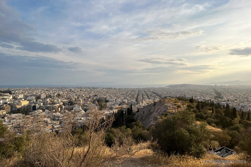 Przysiadamy na chwilę na samym Pnyksie i podziwiamy panoramę Aten. Po dłuższej chwili ruszamy jeszcze na Filopappou, mijając zabytki z kilku epok, rozsiane po terenie obu wzgórz. Teren dawnej mównicy, ruiny fortyfikacji, więzienie Sokratesa, a także kilka pomników i tablic upamiętniających minione dzieje. Wszystko otoczone zielenią. Z jednej strony horyzont stanowi panorama zabudowań Aten, na tle których widać Akropol, a z drugiej – widok na Pireus i Zatokę Sarońską, wyłaniające się spoza kolejnej masy budynków i uliczek. Rewelacyjne wrażenie robi na mnie to miasto ciągnące się od horyzontu po horyzont…