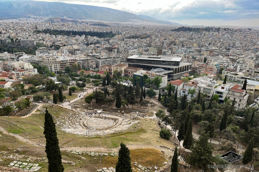 Po przekroczeniu propylejów po raz drugi, tym razem w drugą stronę, decydujemy się z Basią jeszcze na spacer po jednym ze zboczy wzgórza. Tam widzimy pozostałości Teatru Dionizosa, nieco mniej masywnego niż odeon Heroda Attyka. Aż trudno uwierzyć, że miejsca takie jak to, zostały na przestrzeni dziejów zapomniane i wykopane dopiero w XIX wieku w ramach prac archeologicznych. Z drugiej strony – chciałbym być archeologiem, który dokonał takiego odkrycia w ramach rutynowych prac.
