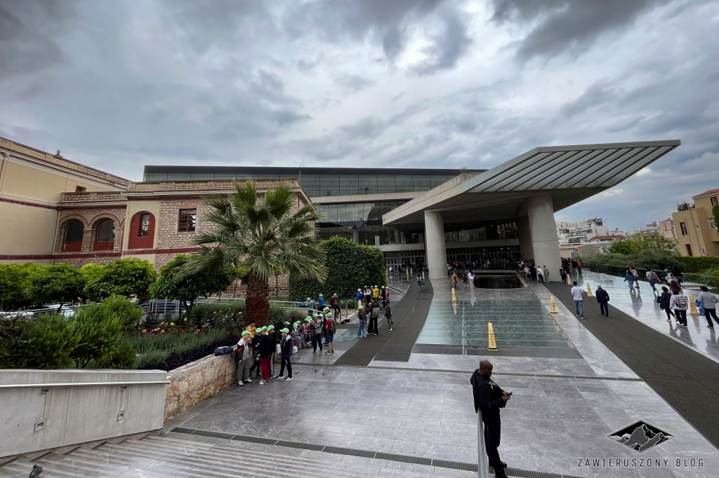 Ostatnim punktem na dzisiejszej liście rzeczy do odwiedzenia pozostaje Muzeum Akropolu, więc to tam ruszamy po obejściu wszystkich placówek archeologicznych. Na miejscu okazuje się, że bilety mój i Basi przechodzą bez problemu, natomiast reszta wycieczki ma ze swoimi mały problem i nie mogą przejść przez bramki. Na szczęście obsługa jest całkiem pomocna i rozwiązuje tę zagwozdkę. Przy okazji dowiadujemy się, że ekspozycja ruin pod budynkiem muzeum jest otwarta tylko do określonej godziny i jeżeli zajdzie potrzeba wykorzystania trefnych biletów na dole, to ochroniarz będzie o tym poinformowany.