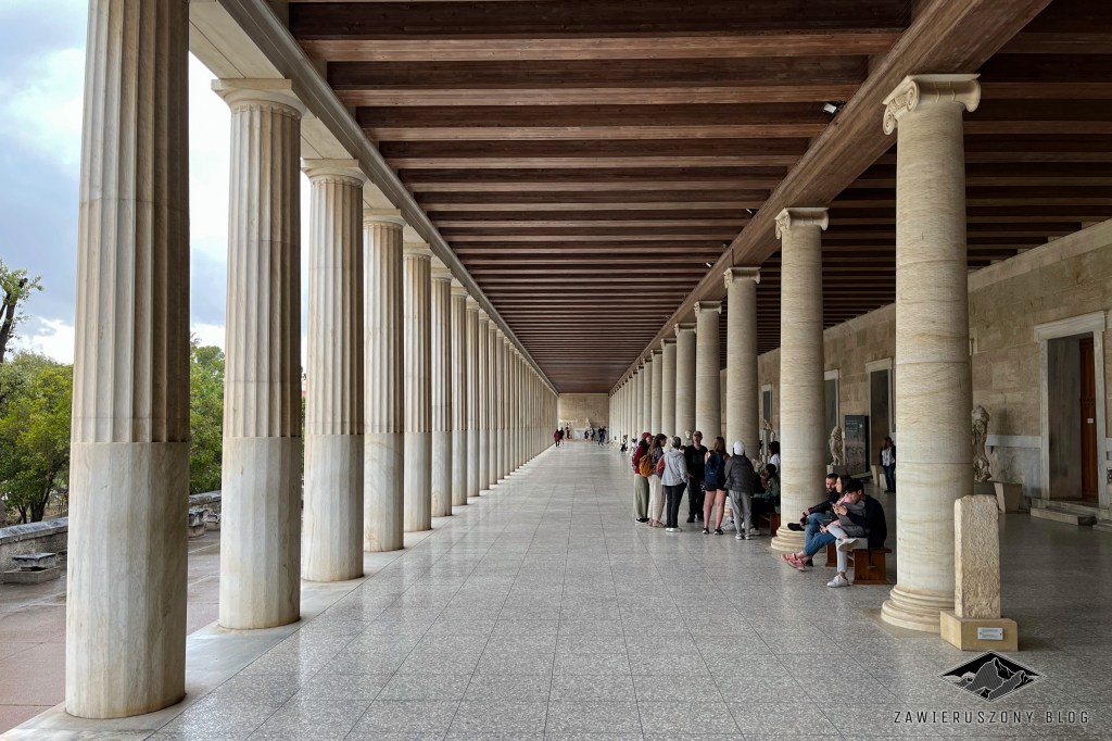 Po przerwie na kawę i późne drugie śniadanie w jednej z piekarni, ruszamy w stronę starożytnej agory greckiej. W poprzednich dwu miejscach spędziliśmy po około pół godziny, ale akurat to miejsce okazuje się być rozległym parkiem otoczonym zabudowaniami lub pozostałościami zabudowań. Na domiar złego deszcz powraca, zatem po wejściu do stoi Attalosa (odmiana od: stoa Attalosa) przez dłuższą chwilę w niej pozostajemy, spoglądając na zazielenione połacie terenu z wysokości pierwszego piętra.