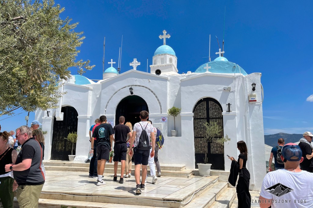 Szczytowi wzgórza uroku dodaje kościółek Agios Georgios ze swoimi błękitnymi akcentami na zdobieniach i dzwonnicą postawioną nieopodal. Na dłuższą chwilę przysiadamy pod wspomnianą dzwonnicą i przyglądamy się z tej perspektywy panoramie miasta z różnych stron i kątów, pstrykając sobie trochę za dużo zdjęć. Niżej kościółka jest jakaś nowoczesna knajpa przy stacji teleferiku, ale tylko obok niej przechodzimy, schodząc ze szczytu drogą alternatywną do tej, którą weszliśmy.
