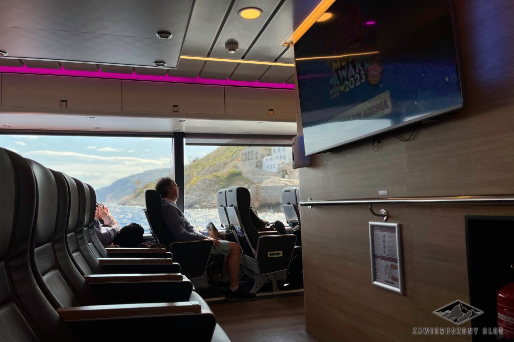 W dalszą drogę zamierzamy wyruszyć jako pasażerowie łodzi znalezionej na stronie Ferryhopper.com[1] . Dzięki zniżkom przysługującym posiadaczom karty ISIC[2], ja z Basią od osoby płacimy €35. Reszta ekipy, bez ISIC – jeszcze drugie tyle. Nie jest to tanie, ale jacht okazuje się bardzo wygodny. Jest nawet lepiej niż w pociągach KD którymi ostatnio często jeżdżę – a nie mam im wiele do zarzucenia pod względem komfortu.