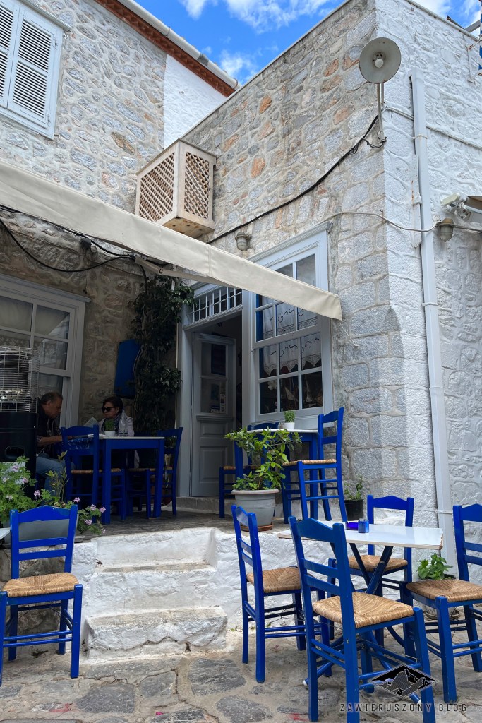 Co do obiadu, niemal każda knajpa w cieniu wygląda kusząco. Ostatecznie decydujemy się usiąść w knajpie και κρεμμύδι! przy uliczce Tompazi[11], gdzie zajadamy apetyczne wariacje potrawy souvlaki i popijamy – tu akurat z dość udawanym zadowoleniem – grecki napitek ouzo. Nawiasem mówiąc, akurat tę knajpę polecała autorka bloga Bałkany Według Rudej w swoim świetnym wpisie na temat Hydry[12]. Myślę, że warto zajrzeć również tam, szukając informacji o tej wyspie.
