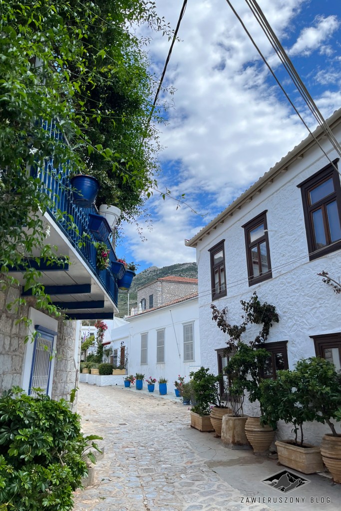 Staramy się podążać z grubsza pod górę, w kierunku w którym powinien wystartować szlak turystyczny biegnący w kierunku klasztoru. W tym czasie podziwiamy pejzaże wybrzeża wyspy, interesujące zabudowania oraz niezmiennie interesujący styl życia tubylców. Jednak przypadkiem, w gąszczu wąskich uliczek, gubimy gdzieś Marcina i znajdziemy go dopiero po wyjściu ponad linię zabudowań Idry. Kto wie, może nie byłoby takich zawirowań, gdybyśmy w stronę klasztoru ruszyli niebieskim szlakiem z portu?